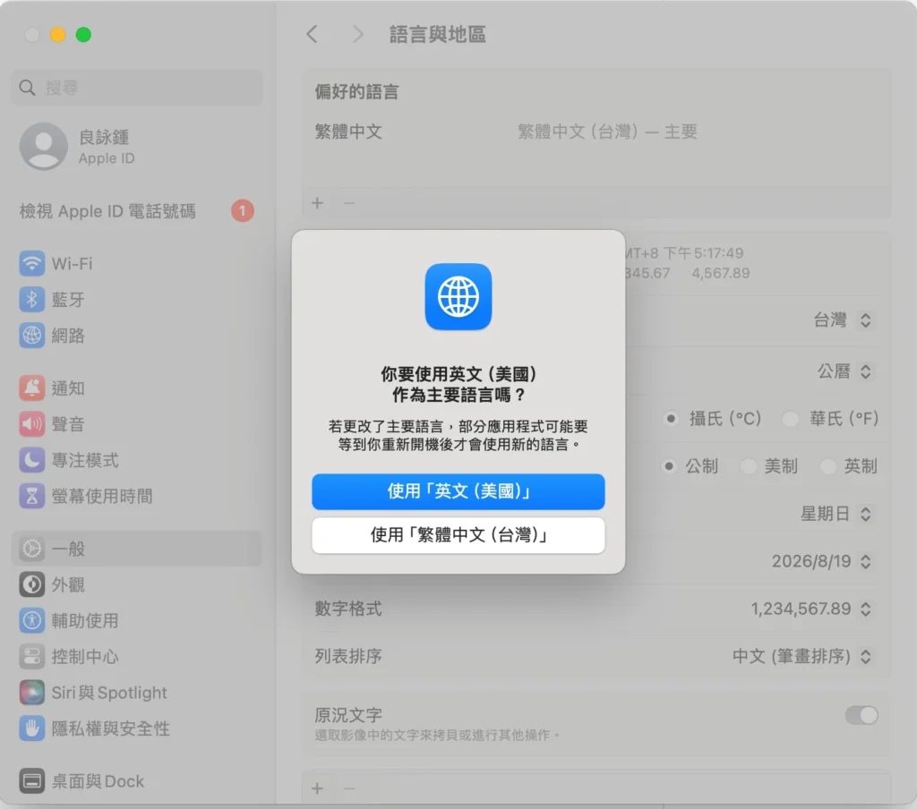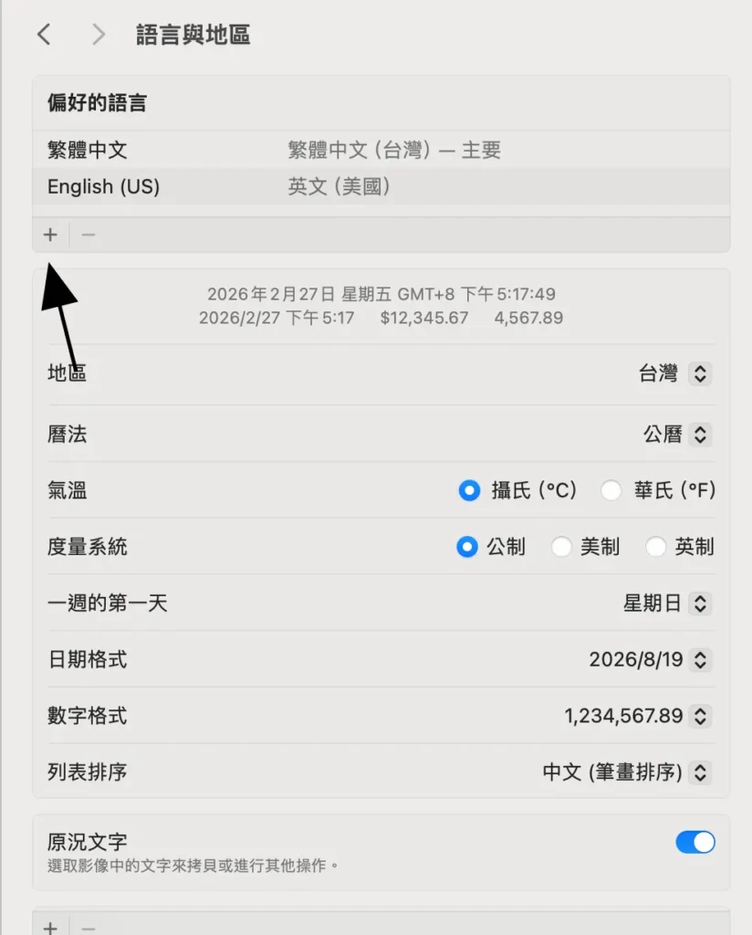 - 到系統設定>一般>語言與地區