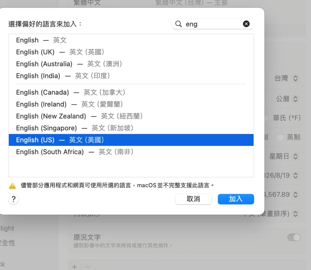 增加English(US)語言, 並且先設定為主要語言。